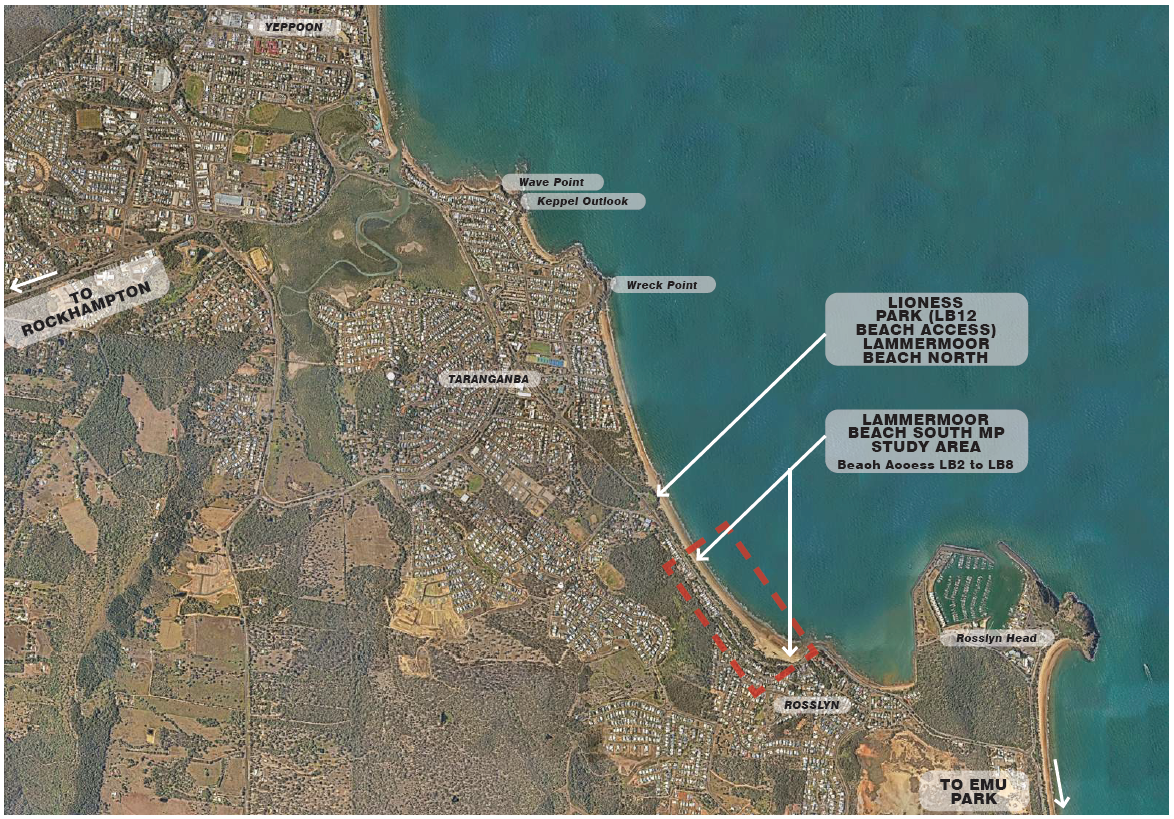 Area D of the Lammermoor Beach (South) scope area incorporates the existing public amenities block, the Capricorn Coast Outrigger Canoe Club access and a large informal parking area near the Clayton Street roundabout.