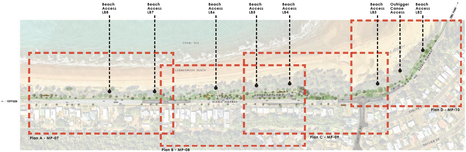 The Lammermoor Beach (South) Draft Master Plan is composed of four distinct map areas - A, B, C and D. Click on the image to open up a larger image on a new page.